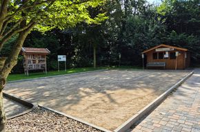 Boule Kugeln sowie die Spielregeln findet man an der Frontseite der Holzhütte.