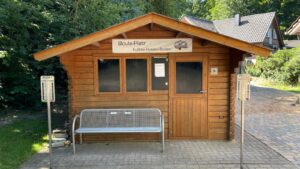 Boule-Kugeln sowie die Spielregeln befinden sich an der Außenseite der Holzhütte.